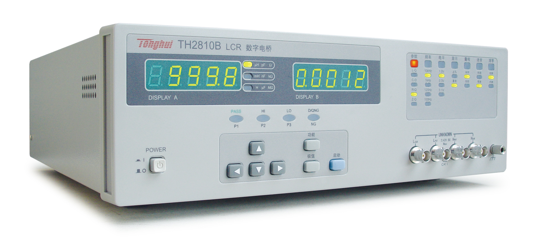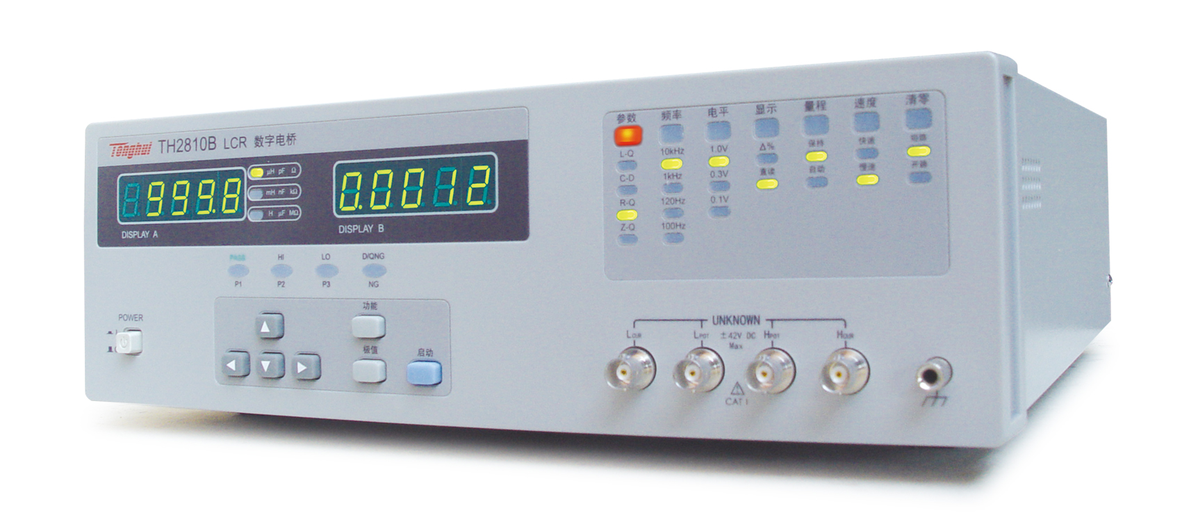 TH2810B LCR數字電橋簡介■?數字電橋 TH2810B型LCR數字電橋是一種測試速度快、精度高、測試范圍寬的通用阻抗測量儀器。 四個測試頻率點,最高至10kHz, 30Ω 、100Ω兩種不同信號源輸出阻抗可使儀器測量結果與眾多LCR結果相一致,同時也能適應陶瓷電容器對測量電平的要求。?應用技術參數型號TH2810B測試參數L-Q, C-D, R-Q, |Z|-Q基本準確度0.1%等效電路串