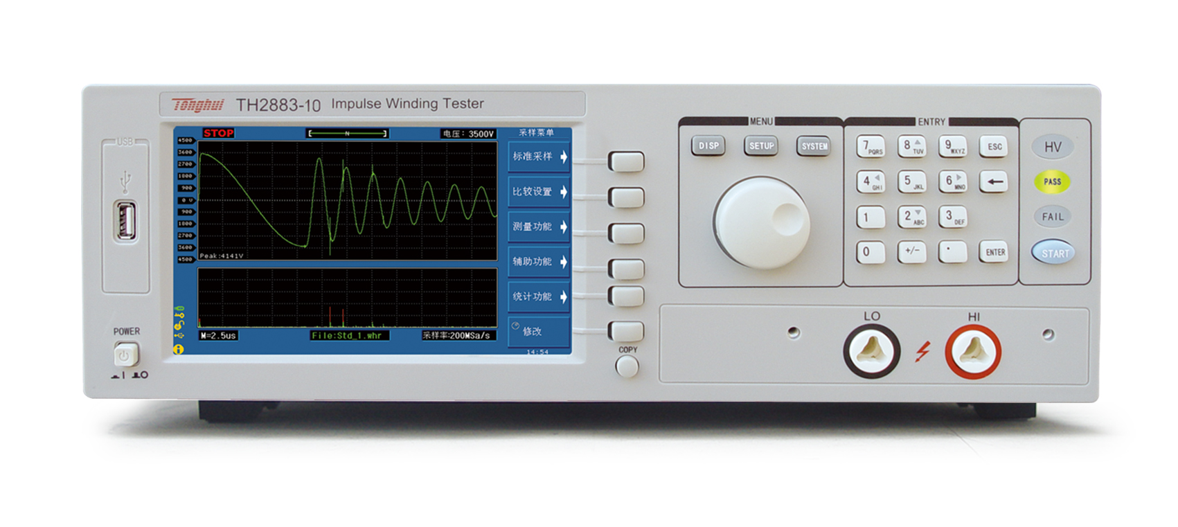 ? 沖電壓,是測試各種線圈的標配產品。TH2883-10具有最高10kV的脈沖 輸出電壓,可測試更高絕緣耐壓的匝間測試。