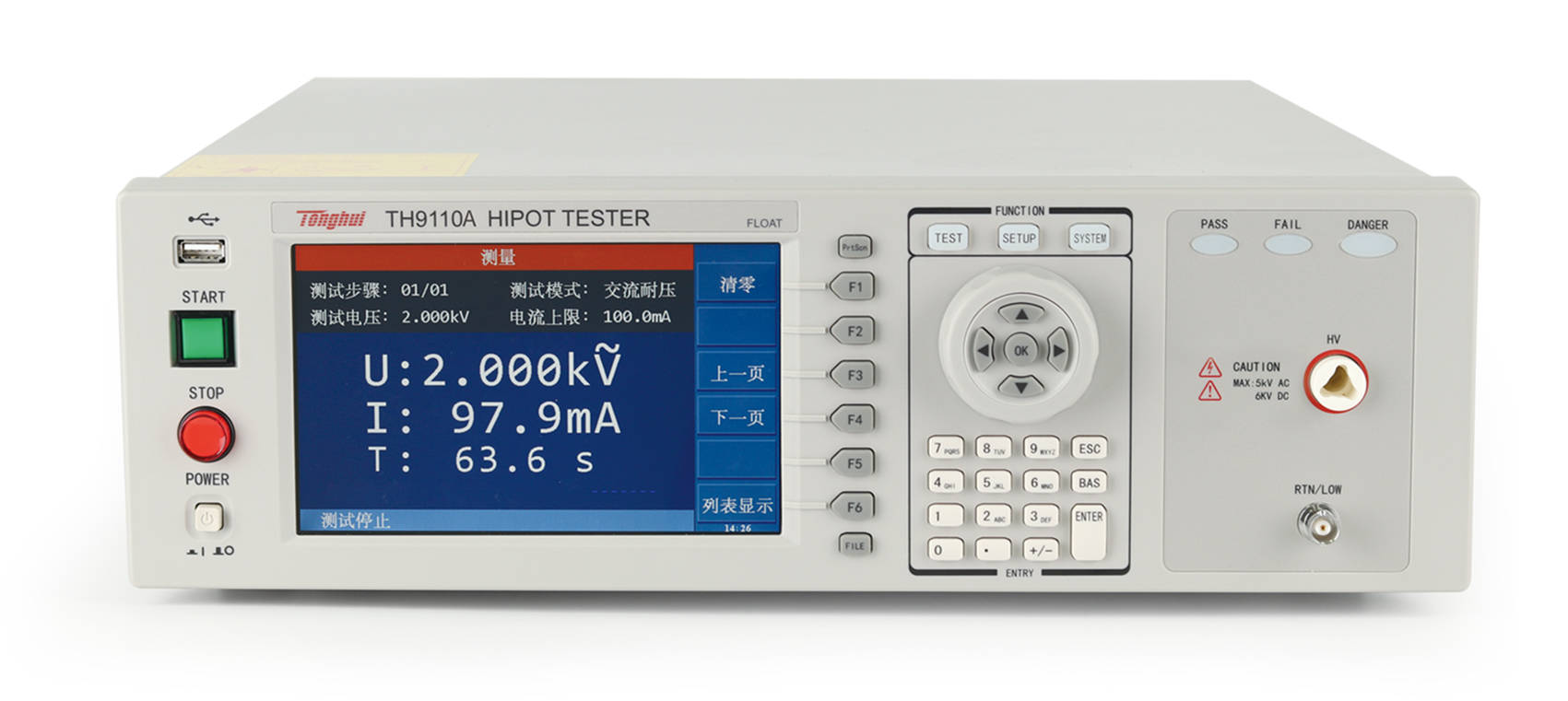 ■?TH9110/TH9110A是集同惠多年電氣安規測試儀的設計經驗,新推出的具有500VA功率,最大輸出交流5kV/100mA的新一代交直流耐壓/絕緣電阻測試儀,符合大功率耐壓測試需求。TH9110/TH9110A系列除了基本的交流、直流、絕緣電阻測試外,增加了崩潰電壓測試功能,可分析產品的擊穿點電壓,滿足特定客戶對產品高壓可靠性檢測的要求; 具有開短路檢測功能,解決了用戶在測試安規產品時的可靠性和準確性問題,輸出時同步進行接觸檢查,避免漏檢,提升測試可靠度與效率。TH9110/TH9110A使用7寸LCD彩色顯示器,測試結果用大字符顯示,更加清晰直觀,方便操作與判斷。觸電保護功能等,確保了客戶在接觸到高壓測試端的時候也不會被電擊傷害,保證操作人員的人身安全。