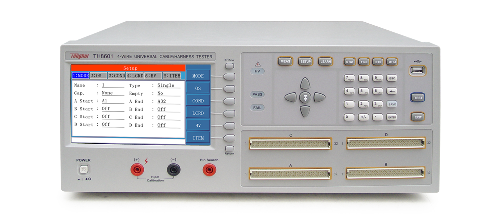 • ■?TH8601系列四端線材綜合測(cè)試儀是專(zhuān)用于各種線纜,線束和排 線品質(zhì)及連接可靠性檢驗(yàn)的多功能,自動(dòng)化的線材綜合參數(shù)測(cè)試 系統(tǒng)。該系統(tǒng)提供可編程的恒流恒壓源以及高壓源,測(cè)試項(xiàng)目涵蓋了導(dǎo)通,被動(dòng)元件(電感,電阻,電容,二極管),交直流耐壓,絕緣電阻各種高低壓參數(shù)。本系統(tǒng)采用先進(jìn)的LCR數(shù)字采樣及高速長(zhǎng)壽命通道切換技術(shù),大大提高了測(cè)試精度,速度以及使用壽命。采用高低壓分離技術(shù),大大的提高絕緣電阻的測(cè)試性能。豐富的接口設(shè)計(jì),本儀器還提供RS232, RS485, GPIB, USB, LAN, Handler等接口,便于用戶(hù)運(yùn)用于自動(dòng)化檢測(cè)和自動(dòng)化產(chǎn)線。