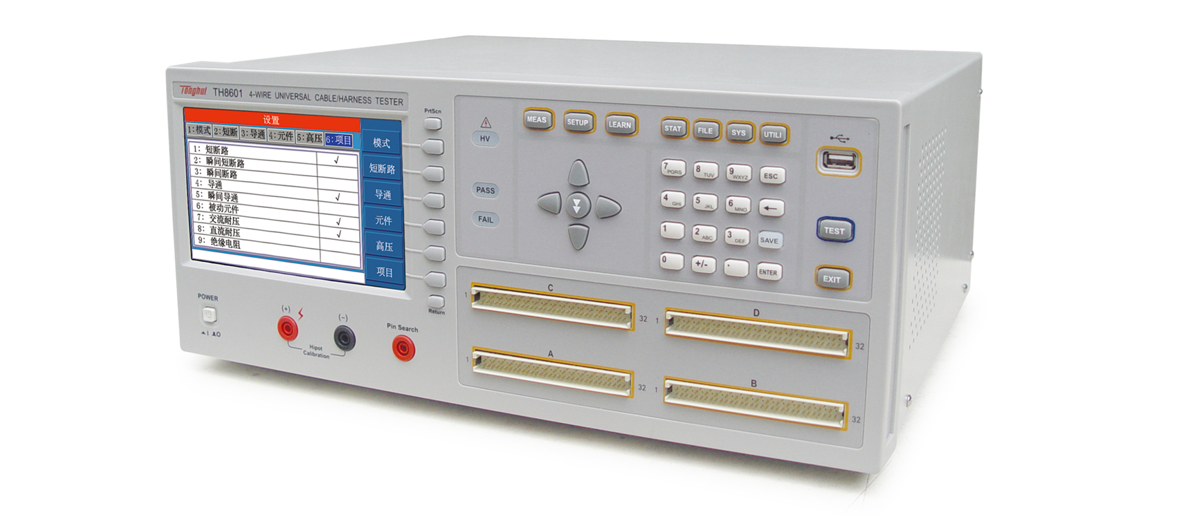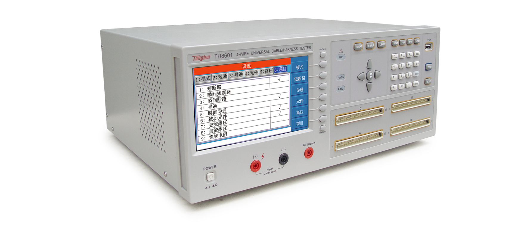TH8601 線材綜合測(cè)試儀簡(jiǎn)介■?TH8601系列四端線材綜合測(cè)試儀是專(zhuān)用于各種線纜,線束和排 線品質(zhì)及連接可靠性檢驗(yàn)的多功能,自動(dòng)化的線材綜合參數(shù)測(cè)試 系統(tǒng)。該系統(tǒng)提供可編程的恒流恒壓源以及高壓源,測(cè)試項(xiàng)目涵蓋了導(dǎo)通,被動(dòng)元件(電感,電阻,電容,二極管),交直流耐壓,絕緣電阻各種高低壓參數(shù)。本系統(tǒng)采用先進(jìn)的LCR數(shù)字采樣及高速長(zhǎng)壽命通道切換技術(shù),大大提高了測(cè)試精度,速度以及使用壽命。采用高低壓