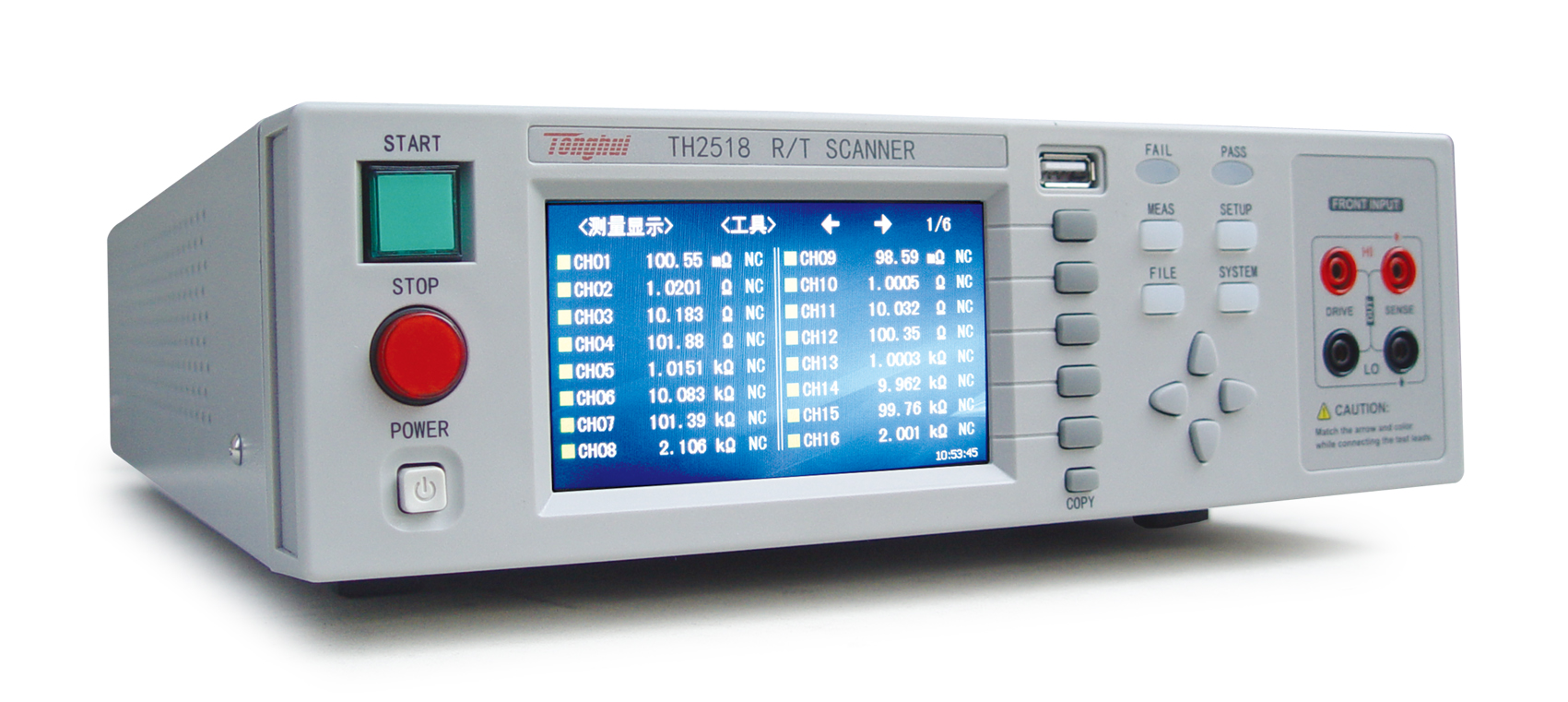 ■ 同惠TH2518系列電阻/溫度掃描儀模擬測試掃描單元采用同步插卡式的設計理念,可支持的插卡板測試單元可達6個,且在插卡板之間實現同步測量,大大提高掃描測量速度。每塊測量板內包含16個測試端,測試端的組合支持用戶可自由編程,最高可配置高達90路電阻/溫度掃描測量通道,每通道測量可單獨設計分選比較邊界以及輸出比較分選信號。溫度測量的采樣方式可配置為PT500鉑電阻、PT100鉑電阻、模擬電壓輸入三種方式以適用不同的應用場合。0.05%的最高電阻精度,在200mΩ量程下,電阻分辨率更是達到了10uΩ的水準,測試掃描范圍從10uΩ到200kΩ。儀器的溫度補償和溫度轉換功能使產品的測試免除環境溫度的影響,可輸出整機級、板級以及各通道的比較分選結果,使您的測試和數據分析處理、產品的分揀工作更加輕松。標配的RS232、USB HOST、USB Device和HANDLER接口既方便您測量數據的快速保存,又方便您遠程的掌控儀器。帶觸摸功能的24位色、分辨率為480×272的彩色液晶屏,給您的測量操作帶來不一樣的感覺!
