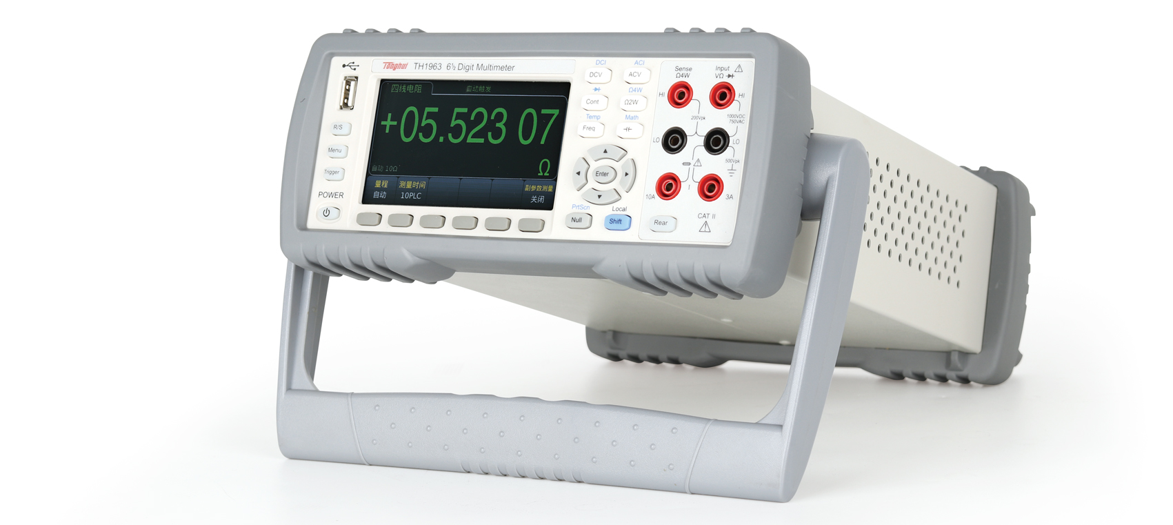 TH1963 六位半數(shù)字多用表應用■ 生產(chǎn)線工作臺■ 維修工作臺■ 教學實驗室■ 自動化測試設備技術參數(shù)產(chǎn)品型號TH1963顯示器4.3寸LCD彩色顯示屏顯示位數(shù)1199999字讀數(shù)測量參數(shù)直流電壓、交流電壓、直流電流、交流電流、直流電阻、電容、頻率、導通、二極管、溫度顯示方式直讀、直方圖、條形圖、趨勢圖測量速度最高1000次/S數(shù)學功能清零功能、最小值/最大值/平均值/標準偏差、dB、dBm通用