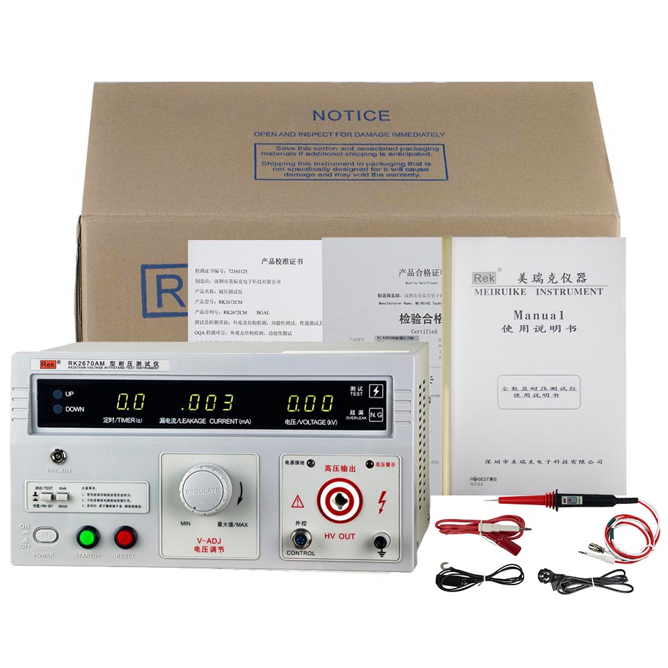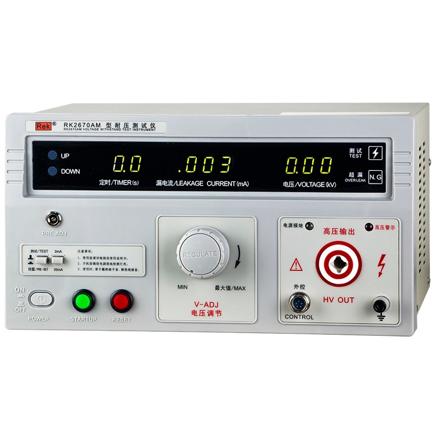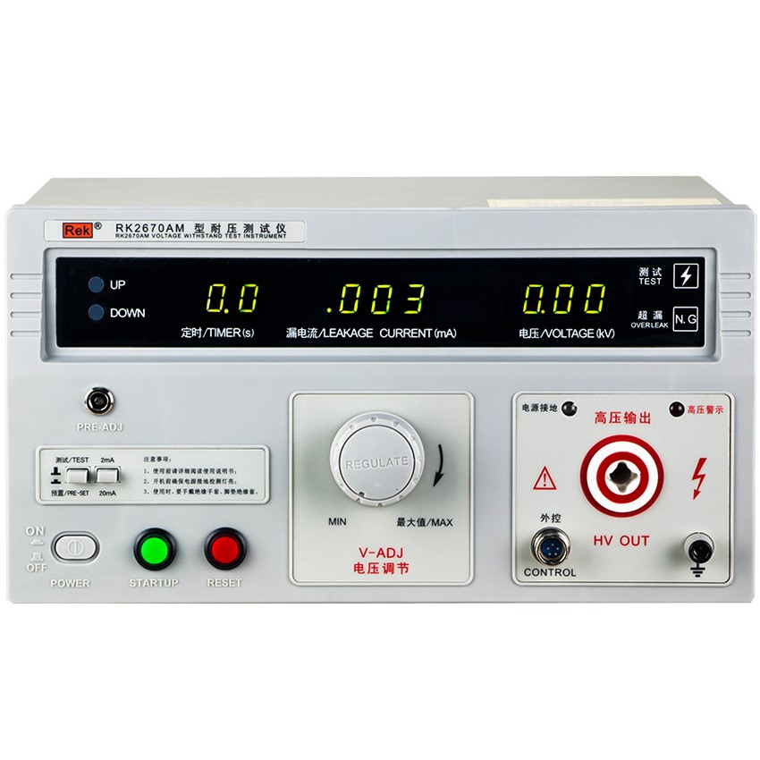 美瑞克RK2670AM型耐壓測試儀是測量耐壓強度的儀器,可以直觀、準確、快速地測試各種被測對象的擊穿電壓、漏電流等電氣安全性能指標,并可以作為高壓源用來測試元器件和整機性能。