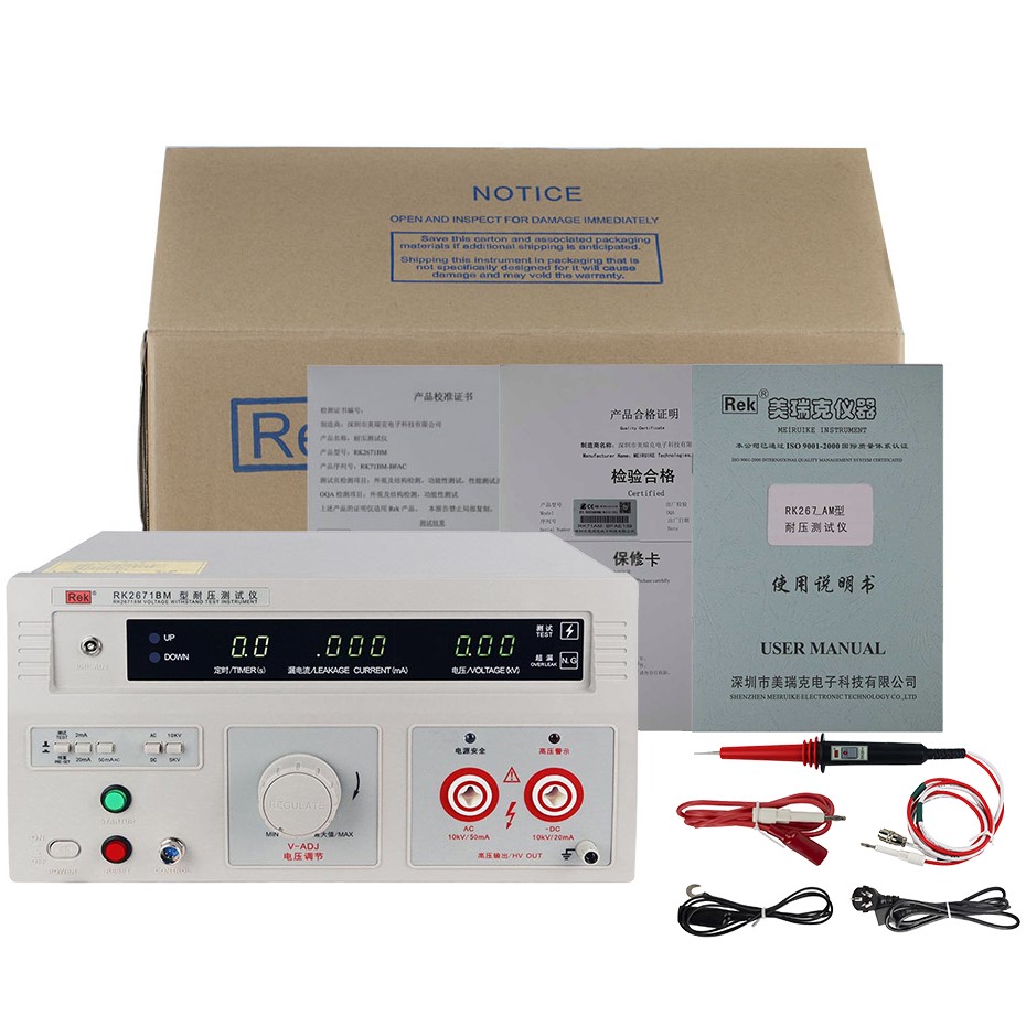 美瑞克RK2671系列耐壓測試儀是測量耐壓強度的儀器,可以直觀、準確、快速地測試各種被測對象的擊穿電壓、漏電流等電氣安全性能指標,并可以作為高壓源用來測試元器件和整機性能。