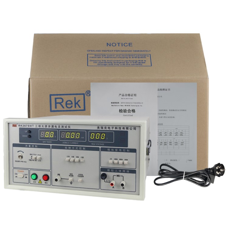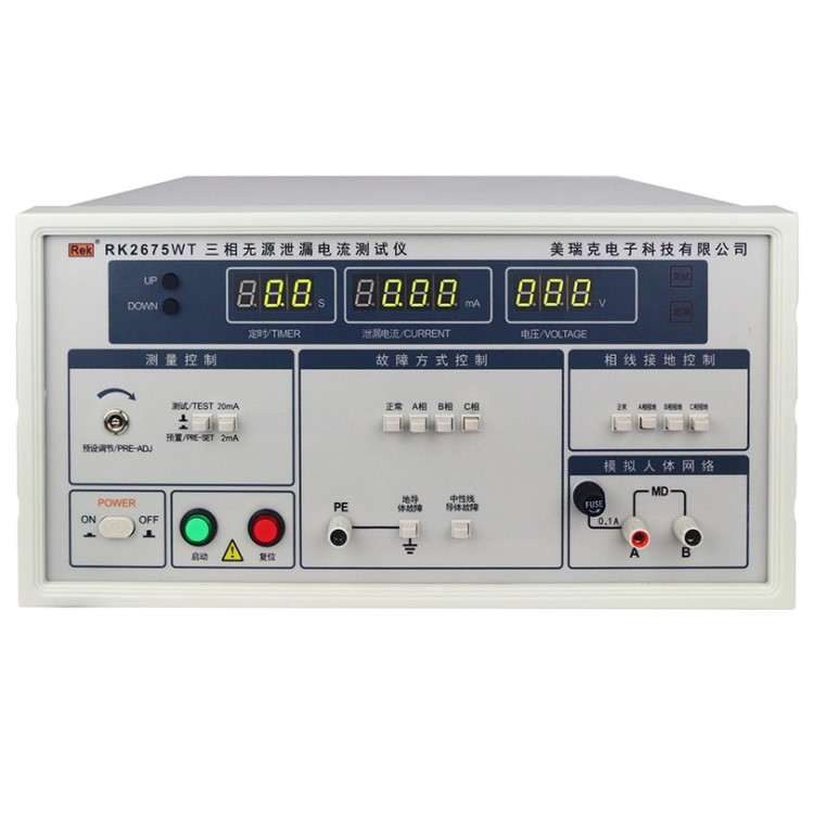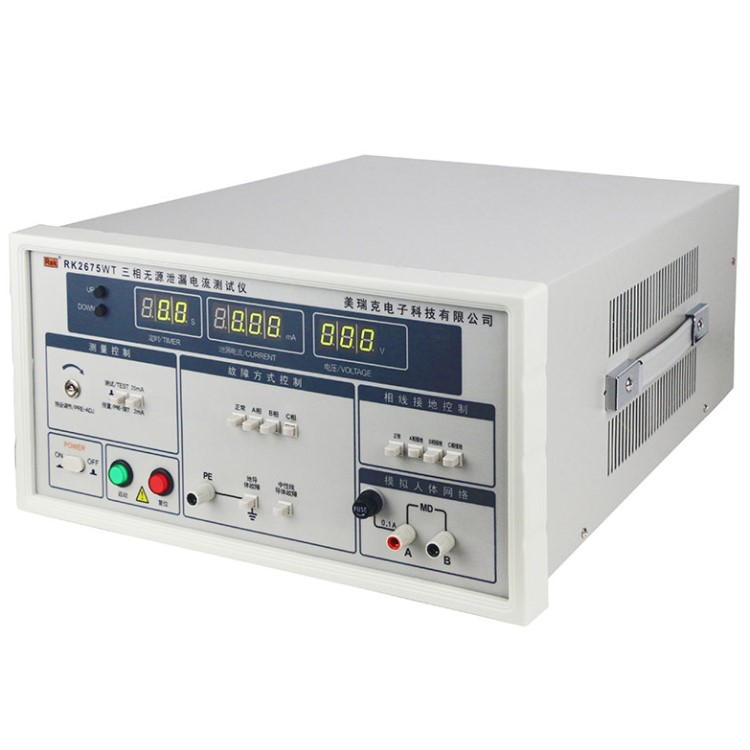 RK2675WT三相泄漏電流測試儀用于測量電器的工作電源(或其他電源)通過絕緣或分布參數阻抗產生的與工作無關的泄漏電流,是衡量電器絕緣性好壞以及產品安全性能的檢測實驗設備。