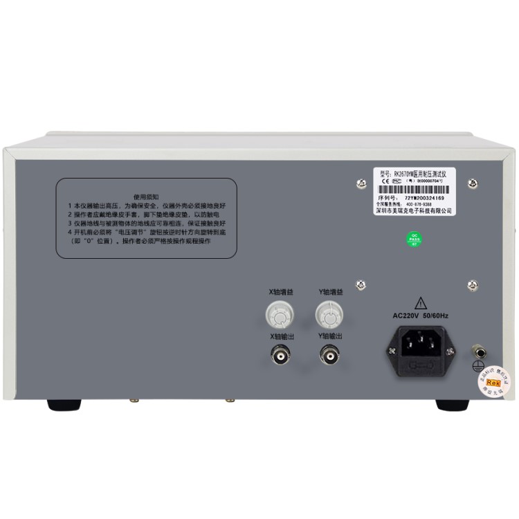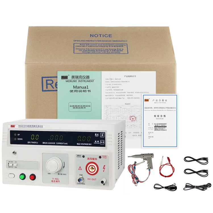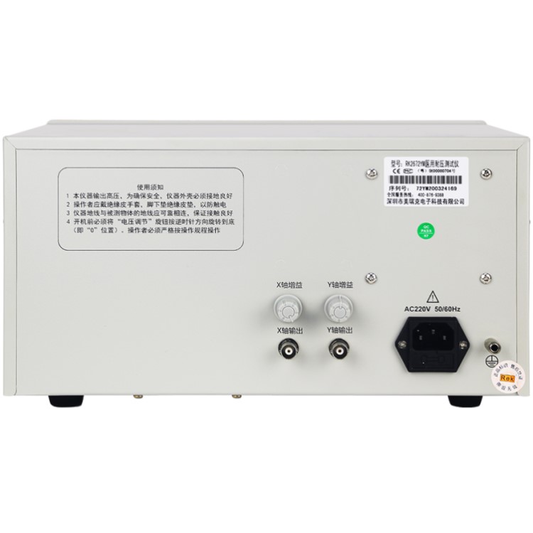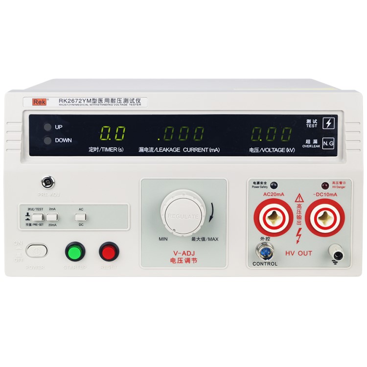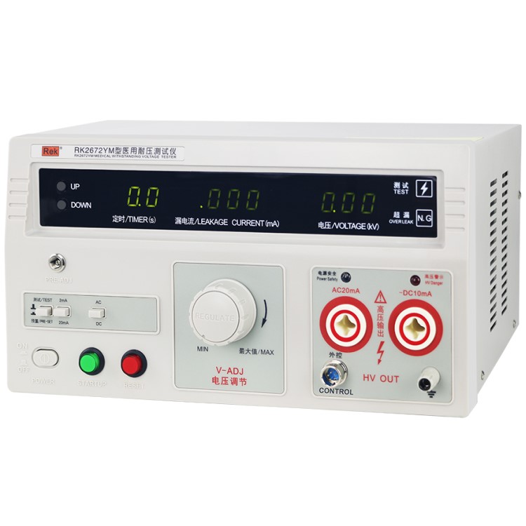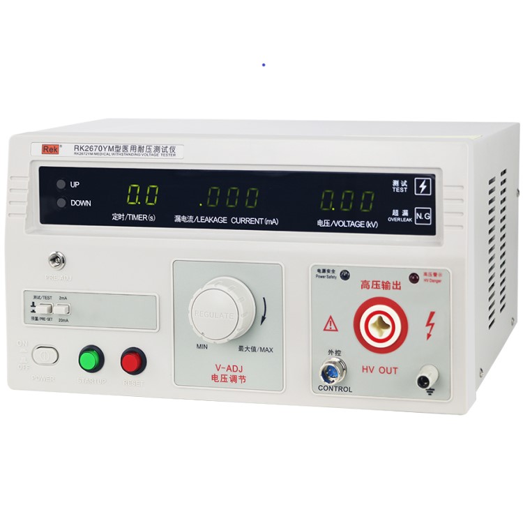 RK2670YM/RK2672YM醫用耐壓測試儀具有常規耐壓側儀所有的功能外,增加了電弧(閃絡)偵測功能,通過外接示波器,可以直觀、準確、快速、可靠的檢測到被測電氣設備的“閃絡”現象,被測電氣設備無“閃絡”現象時,示波器顯示一個穩定的“李沙育圖形(即一個閉合的圓環)”,若被測電氣設備發生“閃絡”現象,則李沙育圖形的邊緣會出現較大的電氣設備發生“閃絡”現象以保證被測電氣設備的安全。本產品同時也適合需要檢測“閃絡”缺陷各種電氣設備等,是醫用電氣設備制造商、維修部門、使用單位以及產品質量檢測部門、技術監督部門不可少的耐壓測試儀。